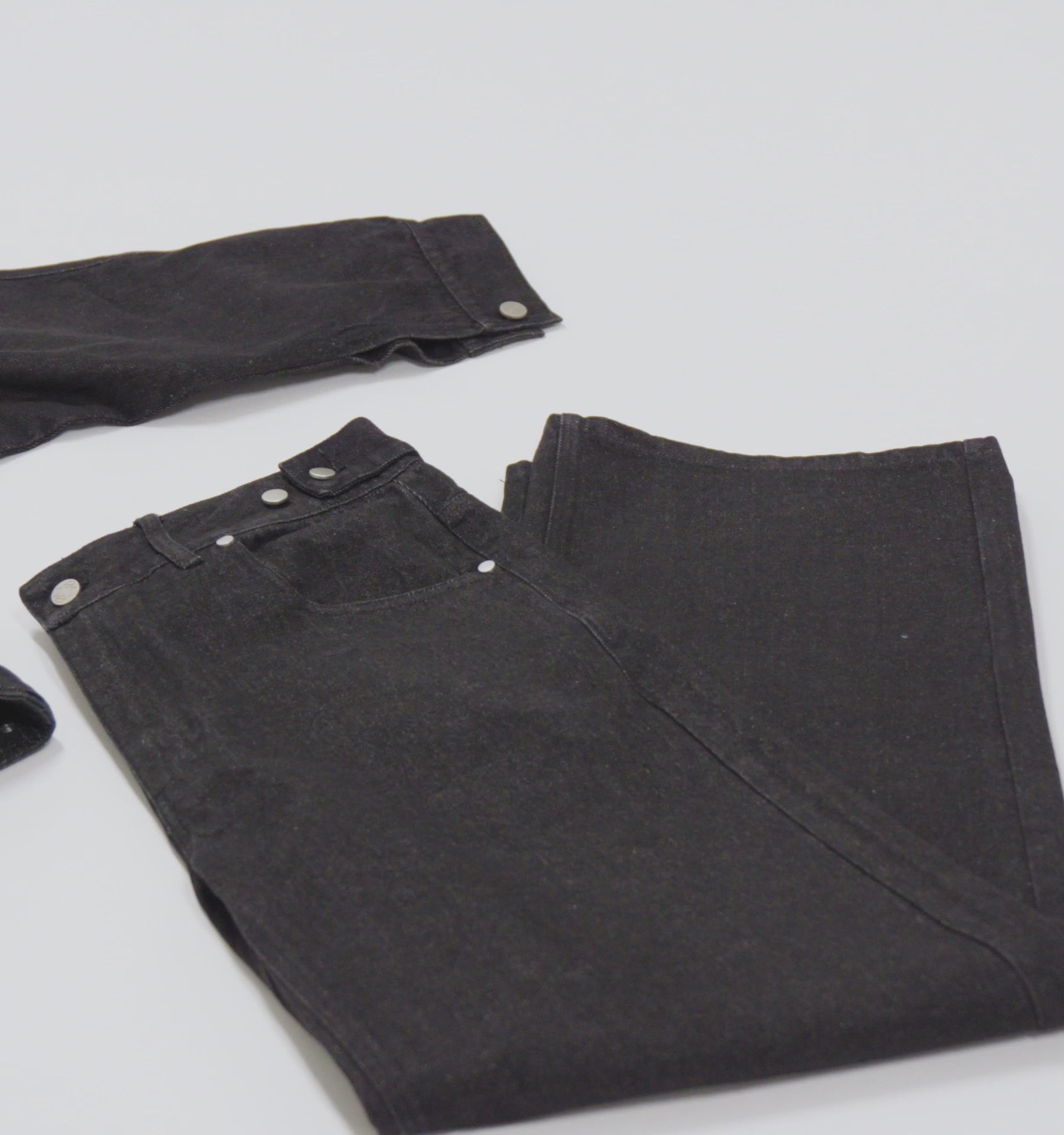 Wide denim jeans i 100% bomuld med et råt, tidløst udtryk. Den afslappede pasform skaber volumen og bevægelse, mens den sorte farve giver et skarpt, sofistikeret look. Designet som et stærkt fundament i garderoben — let at style, sæson efter sæson.